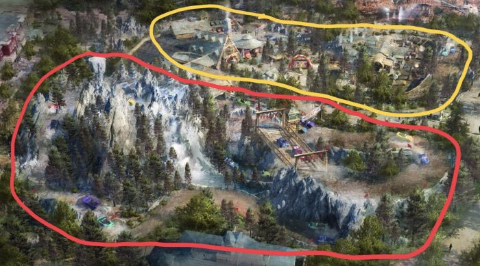First things first, by our best guess, these two areas would appear to be the two different rides. We’ll dub the red circled space as the more “intense” ride and the yellow space as the “family friendly” one.