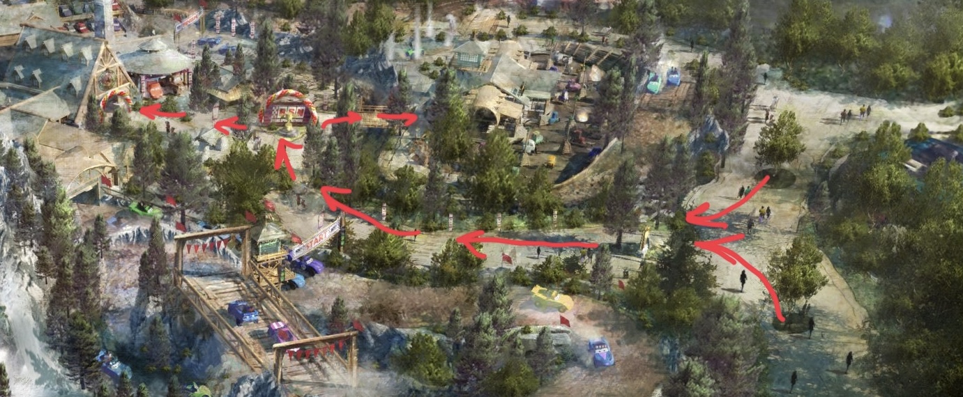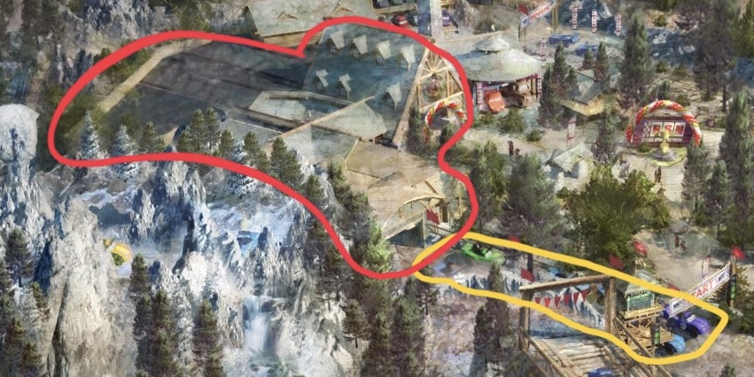 In yellow, it looks like all the cars are lined up at the starting line, which indicates to us that the red circled building must be the show building where we’ll queue up and load/unload from the ride.