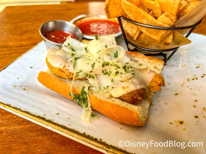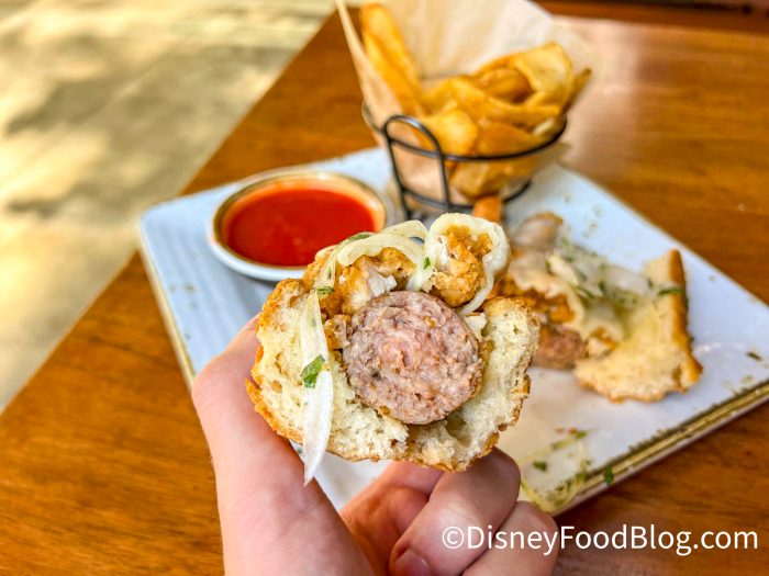 That’s why we’re here, thankfully! We’ve eaten all around the resort, so keep an eye out for all our latest snack news so you know what’s worth your money (and what may not be) when you take your trip. Some dining spots get new menu items each month, which means it is time for us to head over to Craftsman Grill to try its new hot dog of the month. Spoiler alert: we were VERY surprised by this thing.