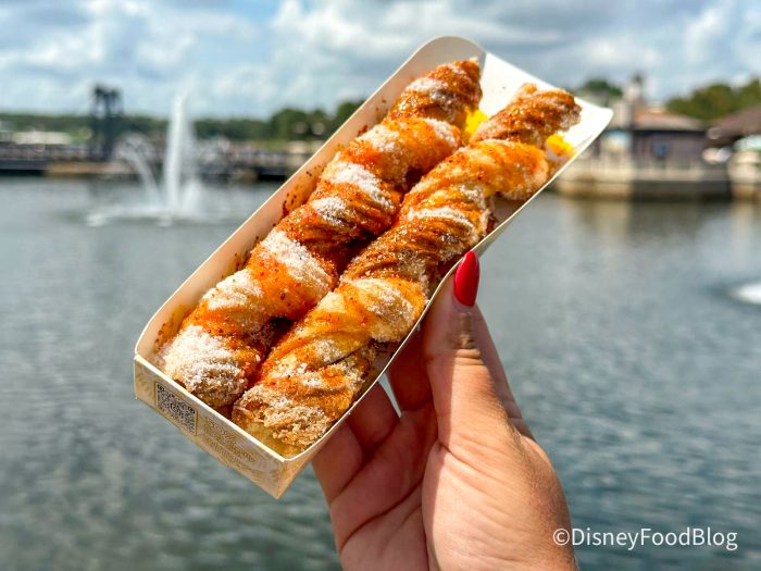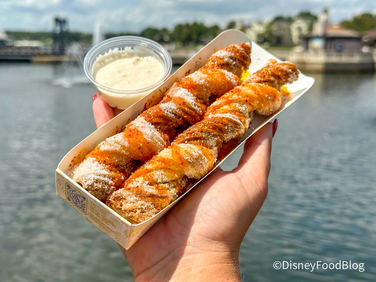 We really liked the addition of the spicy salt seasoning. It added a great heat to the churro without making it taste spicy. It was a sugary spice that worked well with the strong mango flavor. We also enjoyed this churro dipped in the cream cheese, but the cream cheese did get a bit thick as we were eating. But, you can just stick it out in the sun a bit and it will get melty again.