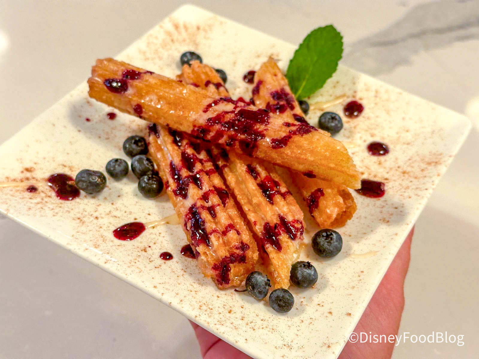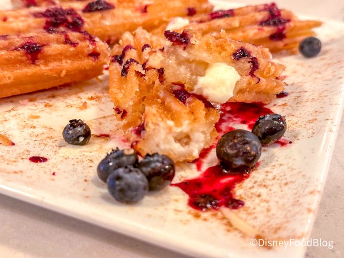The churros are cream filled on the inside, but we didn’t get much beyond a slight cream cheese flavor. The blueberry margarita flavor is mostly in the blueberries that are scattered around the churros. The blueberries taste like they have been soaking in the margarita syrup and almost all the flavor comes from them. They are a little tart and have wonderful flavor. To really enjoy the flavor of this dish, make sure you are eating the blueberries and the churro all in one bite!