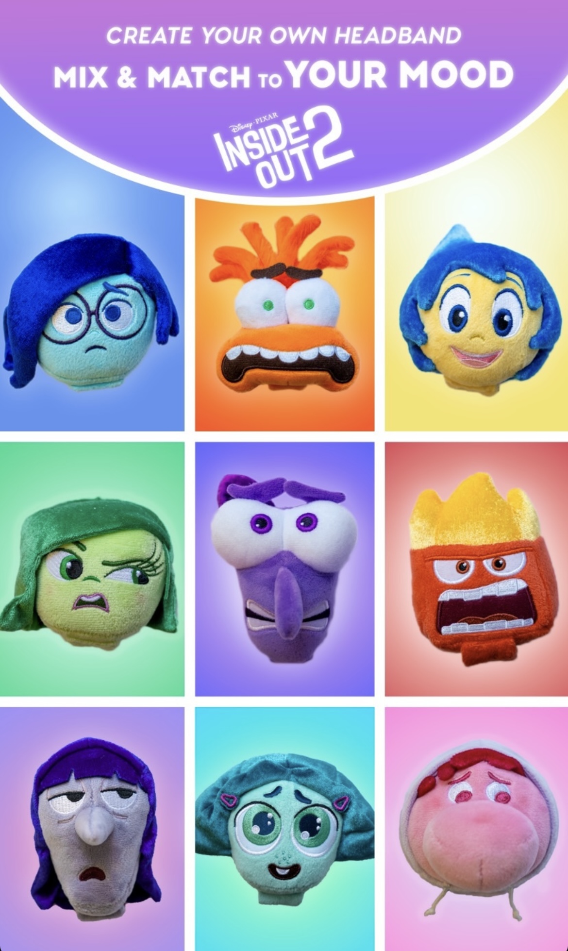 Now Inside Out 2 characters have been added to the options! You can select from your favorite emotions and add them to your headband. Are you feeling lots of Joy or do you need to get a bit of Anger or Anxiety out? Whatever you are feeling, there is a new mini plush accessory to fit your mood. There are nine different emotions to choose from. You could even change them out the day so everyone around you knows how you are feeling!