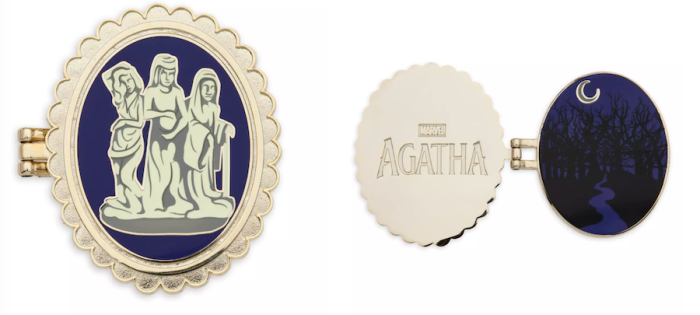 This 22 oz. tumbler features a reusable straw, and “gothy allover art with ”Agatha” text, the Marvel red brick logo and an image of Agatha’s cameo brooch depicting the Three Goddesses.”