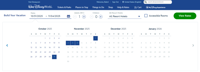 Disney World has had bookings available for 2025 for a while now, and usually when bookings for a year open, it includes the whole year. However, for some reason, bookings for November and December in 2025 are still no longer available. That’s weird, right? If you go to the Disney World website to choose dates — those dates are grayed out because they’re unavailable. The latest date you can book through is November 4th.