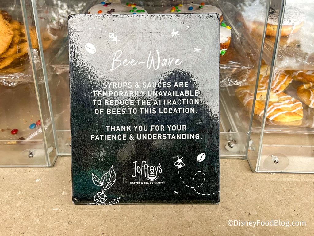 When they got to the next Joffrey’s stand, they noticed a sign out front that said, “Syrups & sauces are temporarily unavailable to reduce the attraction of bees to this location.”