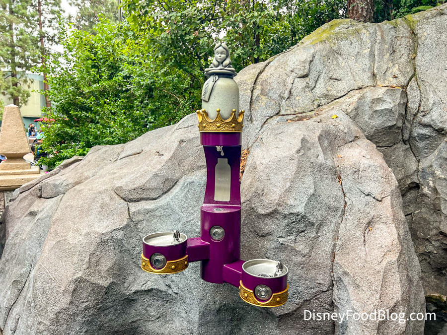 Located in Fantasyland near the King and Queen Restrooms, the station has a regal purple color scheme and features a spot to refill a water bottle, as well as two water fountains, including one at a child’s height.