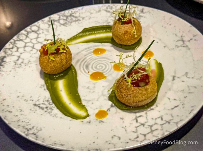 Space 220 is debuting several new menu items soon to celebrate the restaurant’s THIRD (!!!) anniversary — and we got to try them out! We started with the Neptuna Tartare made with Bluefin tuna, wasabi-avocado, pineapple, and mango panipuri.