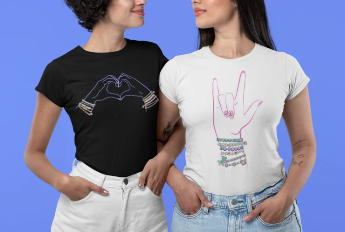 Our second design is inspired by The Little Mermaid AND Taylor Swift. The design features the iconic “I love you” sign in American Sign Language along with Taylor Swift’s friendship bracelets.