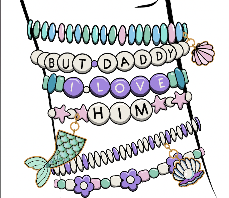 The bracelets read “But Daddy I Love Him” which is a nod to both Ariel in The Little Mermaid and Taylor Swift’s song by the same name.