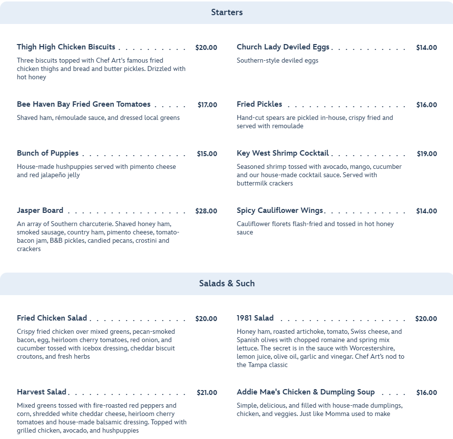 - You want some Southern comfort food. This restaurant SHINES in this category! Expect Southern classics with Florida inspired flavors. There are lots of options and you are sure to leave feeling full and happy.