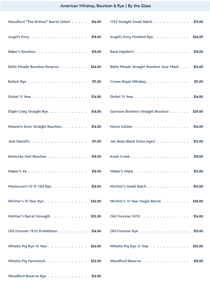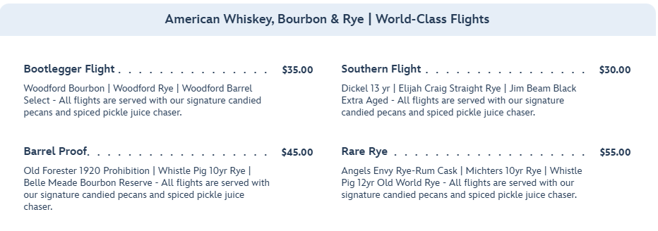 …as well as American Whiskey, Bourbon, and Rye flights.