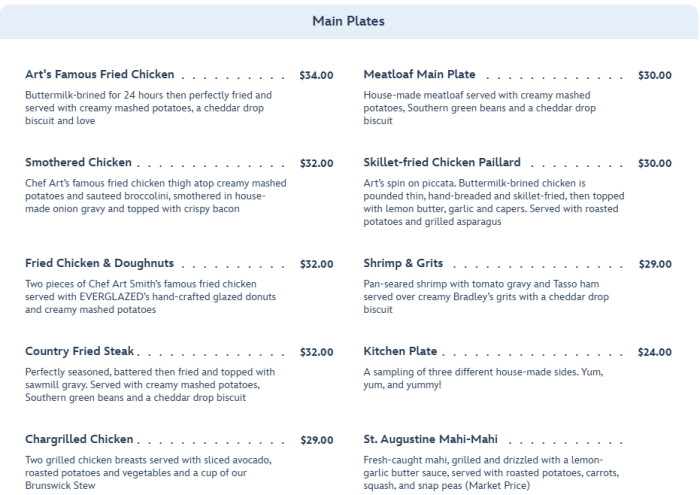 There are also LOTS of options for main plates including Art’s Famous Fried Chicken, the new Meatloaf Main Plate, and the new Smothered Chicken. You can also get Fried Chicken and Doughnuts, Shrimp & Grits, or St. Augustine Mahi-Mahi.