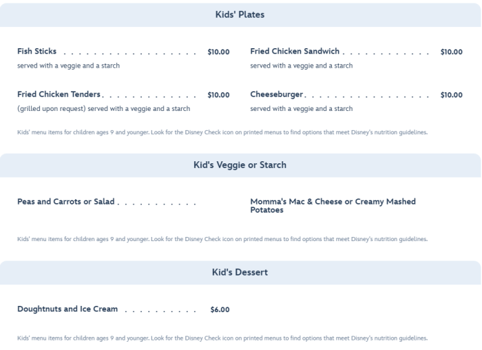 There are also options for the kiddos, including Fish Sticks and a Fried Chicken Sandwich.