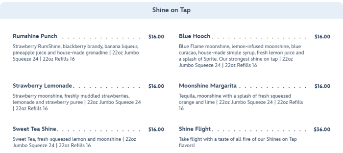 Not only does Homecomin’ have a large menu of food, but the beverage section is even more extensive. You can choose from six different shines on tap.