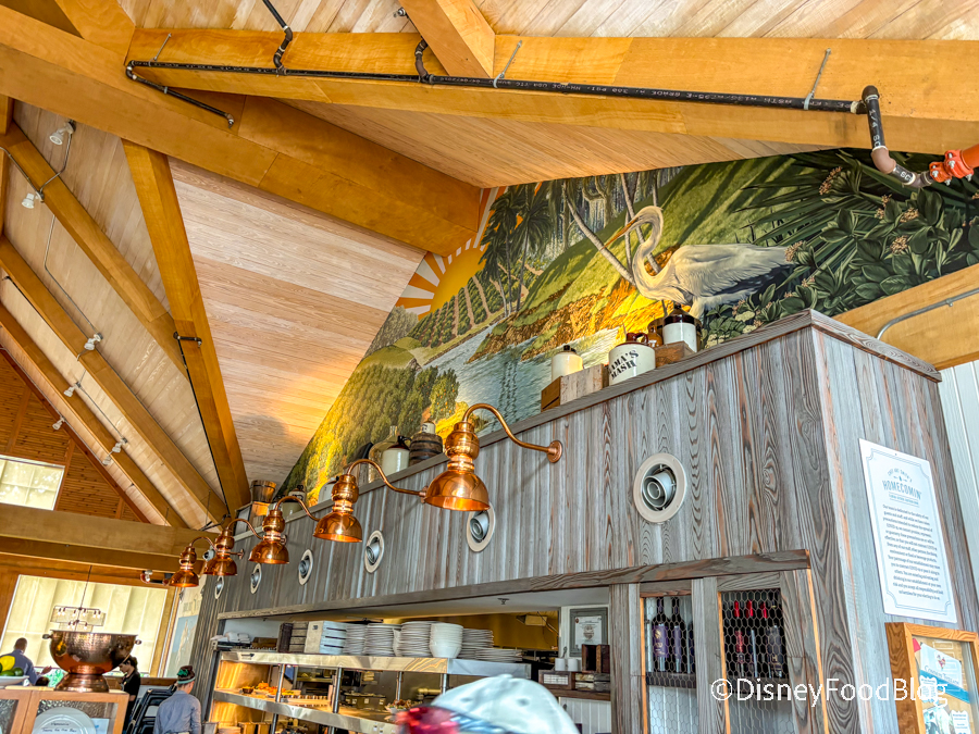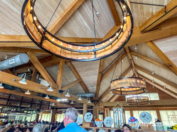 There are lots of wooden features mixed with metallic accents. There is plenty of warm lighting that lends itself well to the cozy and welcoming atmosphere. You can even spot a collection of plates behind the host station. You may recognize a few names, including Jodi Benson and Angela Bassett. Plus you might spot a pretty famous mouse!