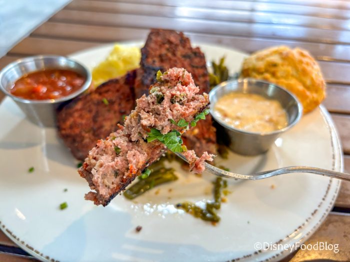 Next up, we tried the new Meatloaf Main Plate. This dish includes house-made meatloaf served with creamy mashed potatoes, Southern green beans, and a cheddar drop biscuit. The meatloaf costs $30. We were surprised with the amount of flavor that was packed into the meatloaf. If you are used to bland, cardboard-tasting meatloaf, your tastebuds will be pleasantly surprised by this dish. The meatloaf has a hint of spice to it, but we would not consider it to be a spicy dish. We tasted a lot of ketchup flavor in the meatloaf, but it was balanced with lots of herbs. The herbs added lots of depth to the flavor. The meatloaf was a great texture without being too dry.