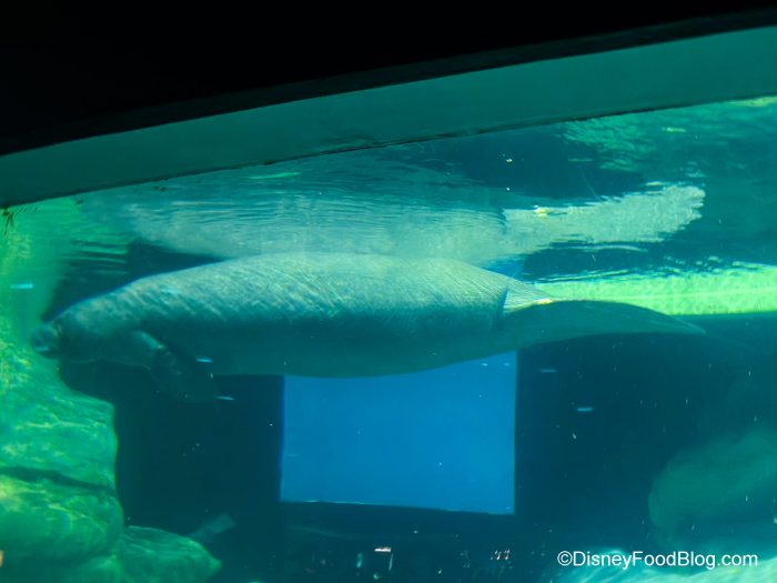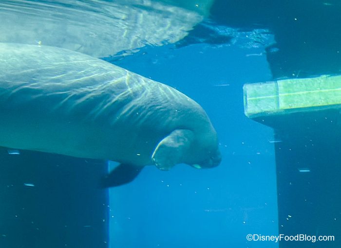 You can often see these manatees in The Seas pavilion, so we thought we’d pop in to say hello. While there, we discovered that Disney has recently rescued a NEW manatee and he has the BEST name: Inigo. As in Montoya. As in The Princess Bride. We love a nerdy reference, y’all. Anyway, he’s got some scars, bless his little manatee heart, so Disney is rehabilitating him. So meet this little guy right now: