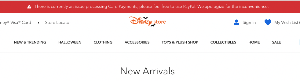 Also, the Disney Store website has been updated with a warning about this payment issue as well. It looks like it’s affecting more than just the parks! PayPal is still available as a payment option, but cards cannot be processed for online shopping purchases.