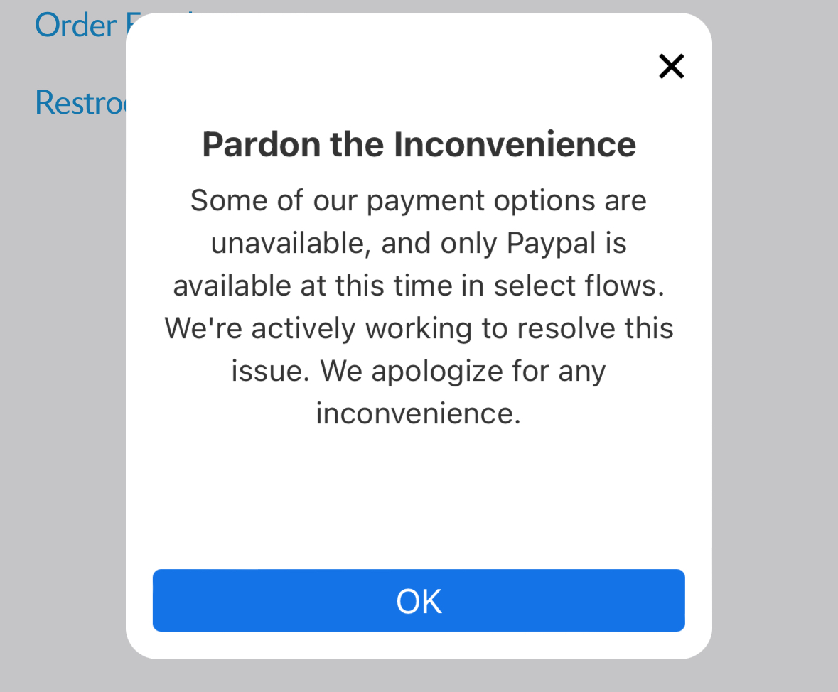 This morning we got a warning message on the My Disney Experience app letting us know that some payment options are currently unavailable. At this time, PayPal is the only thing available in “select flows.” Disney notes that it is actively working to solve the issue.