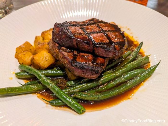 We also ordered the Grilled Medallions of Filet Mignon for $49, made with Crispy Brabant Potatoes tossed with Onions, seasonal Vegetables, Zinfandel reduction. Note that you can add lobster meat for an additional $12 (but we didn’t). Well, we hate to say it, but this is where the meal failed us. The steak was overcooked: we ordered medium rare and got medium.