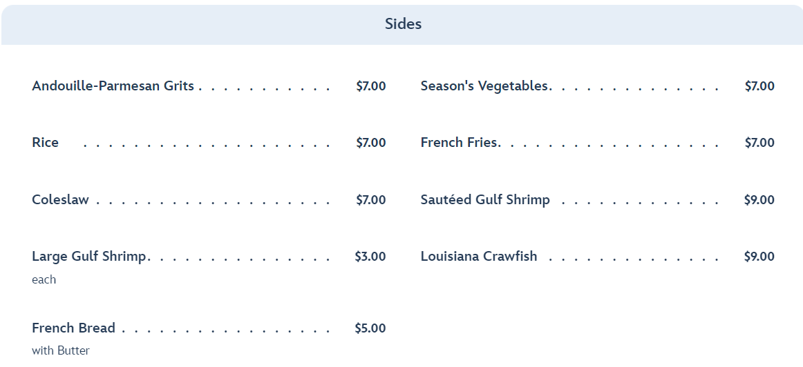You can also order Sides to go with your Entrees, including Andouille-Parmesan Grits, Rice, Louisiana Crawfish, and more.