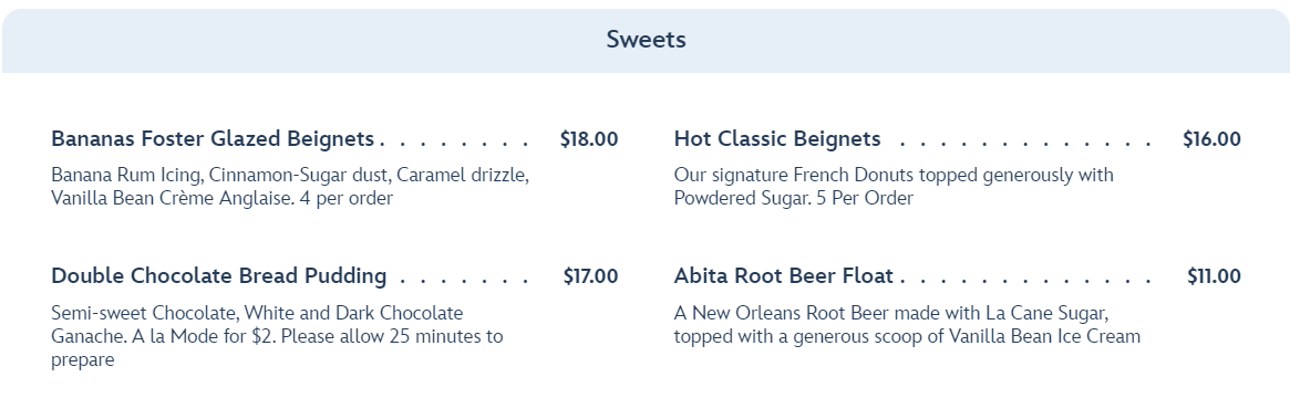 If you’re craving something sweet, you can order Beignets, Double-Chocolate Bread Pudding, and more.