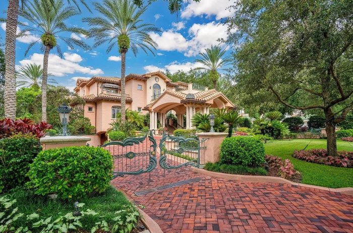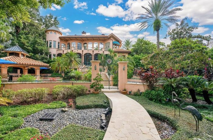 The home was influenced by the Art Nouveau Movement and has been host to several distinguished guests. It features a “grand porte cochere entry” rich with many Disney influences and touches within the granite, marble, wood, stone, and iron finishes.