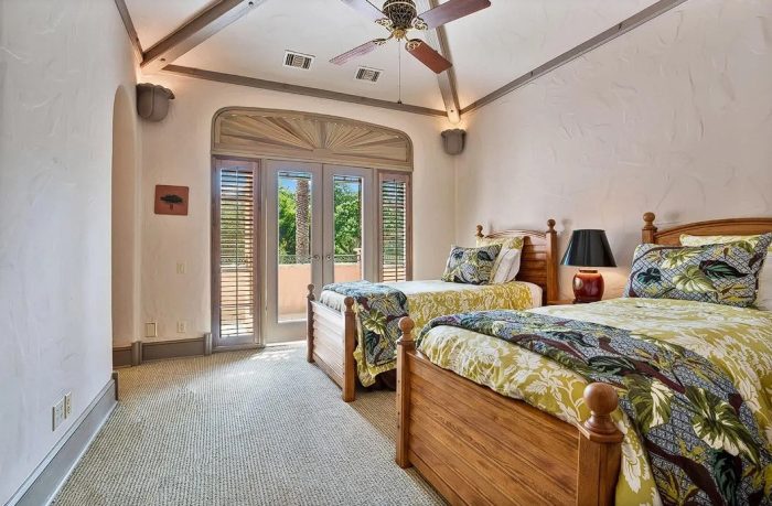 Let’s get into the nitty gritty now. The primary suite comes with double doors that open to a balcony overlooking the living room and another opening to a private terrace.