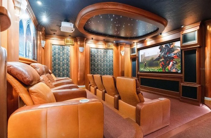 Featuring a living room with a 26-foot-tall ceiling, a painting of Yosemite National Park painted in 1933 by Maurice del Meu hanging over the Coquina and French limestone fireplace, and a large home theater with a photo of Walt Disney on the wall, this home is the definition of the word “lavish”.