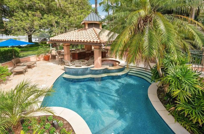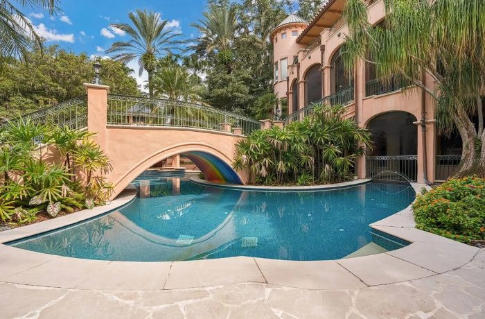 The pool includes a rainbow bridge in addition to a swim-up-bar with underwater bar stools.