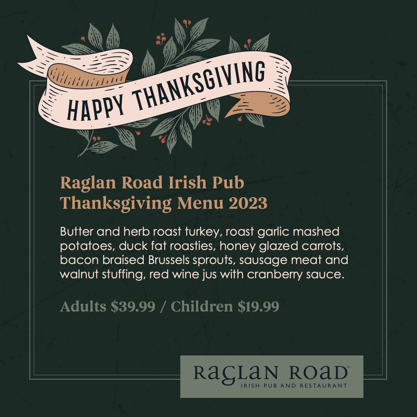 In 2023, Thanksgiving dinner at Raglan Road cost $39.99 per adult and $19.99 per child.