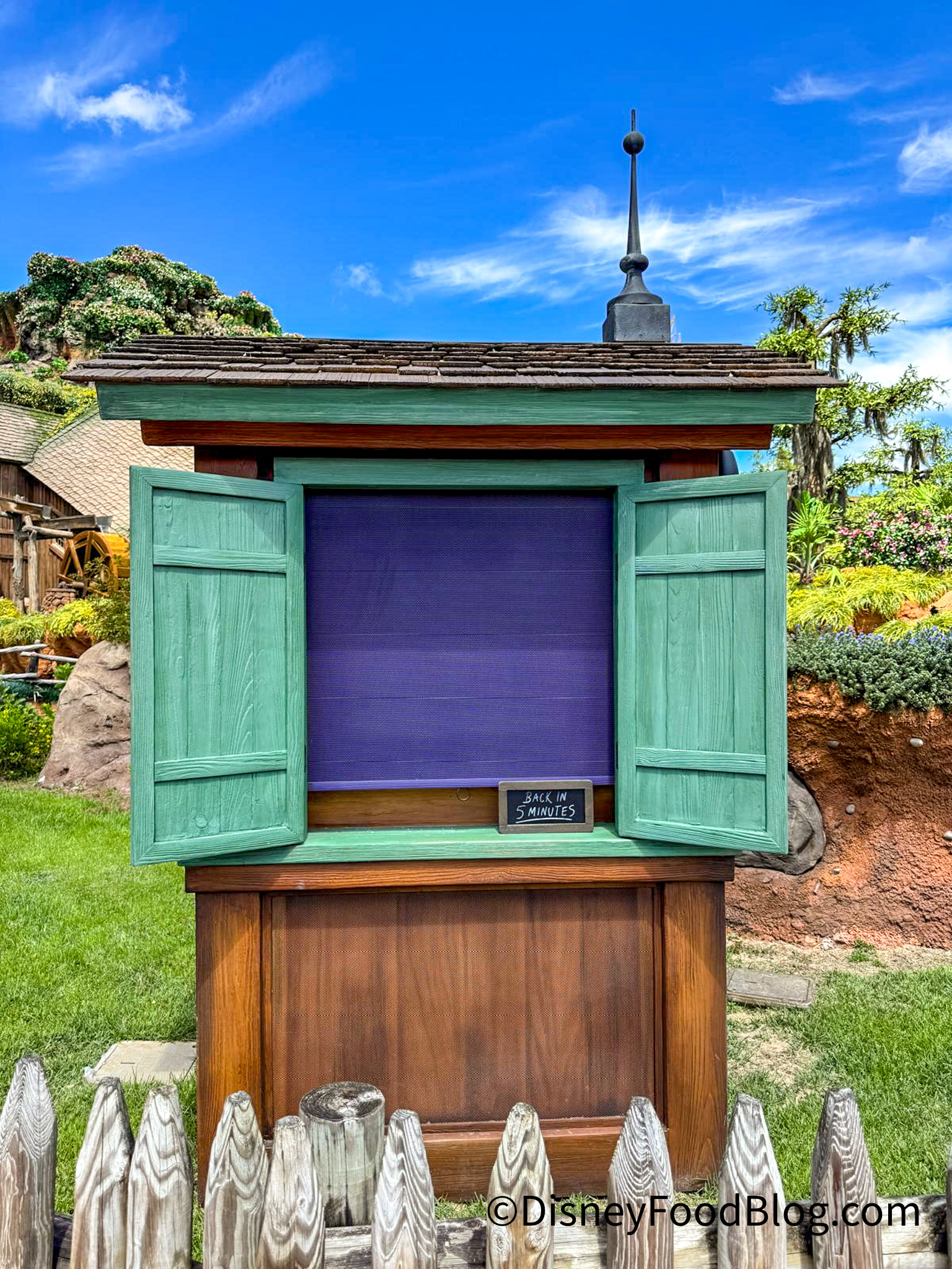 When you are heading to Tiana’s Bayou Adventure from Adventureland (near where the parade starts in Frontierland), there is a booth behind a fence in the grassy area of the attraction. We noticed this booth before the ride was open and assumed that it would be important to the story or theming, but it has been three months, and it just sits there. One of our reporters went to get a closer look at the mystery booth.
