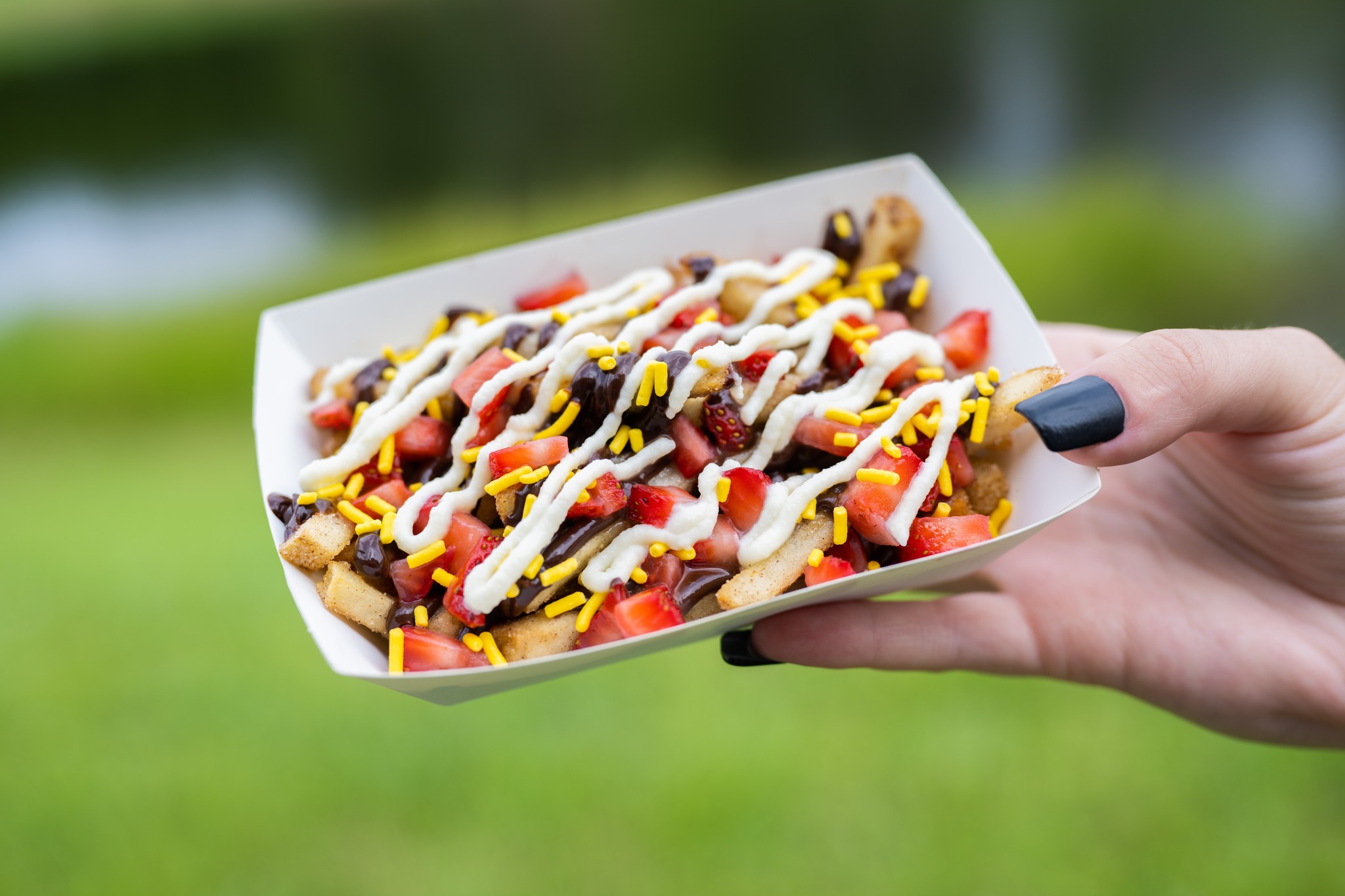 These next fries might be the most interesting of the bunch — dessert fries! New Strawberry Chocolate Fries will be available at Mr. Kamal’s in Animal Kingdom and Primo Piatto at Disney’s Riviera Resort. This treat features cinnamon-sugar-dusted french fries topped with chocolate ganache, strawberries, and honey cream cheese.