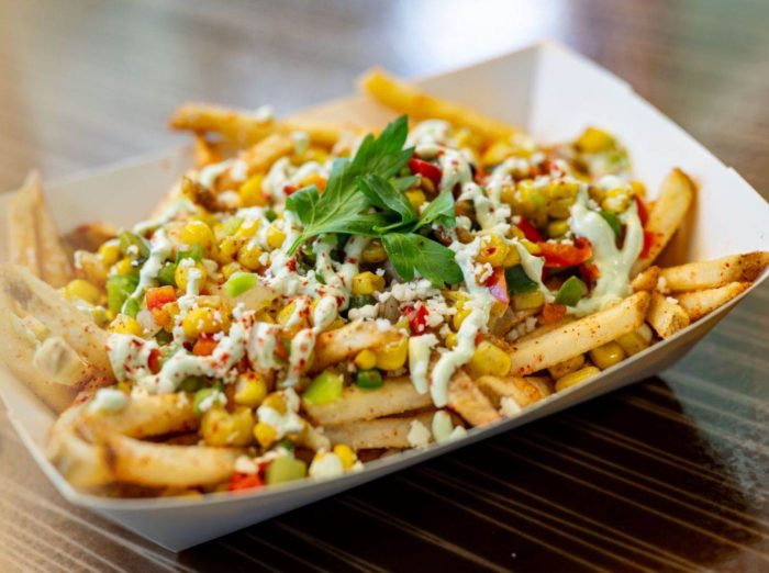 Next up are the Street Corn Fries at Intermission Food Court, End Zone Food Court, Riverside Mill Food Court, and Everything POP Shopping & Dining! This snack is topped with roasted corn relish, cotija cheese, and cilantro-lime crema.
