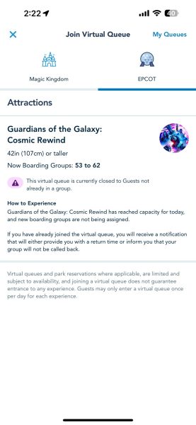 Our reporter initially made an EPCOT reservation with one goal in mind — snagging that Guardians VQ. And, he got it! But here’s what he did. Instead of sticking to his EPCOT reservation for the entire morning, he decided to modify it after securing his VQ.