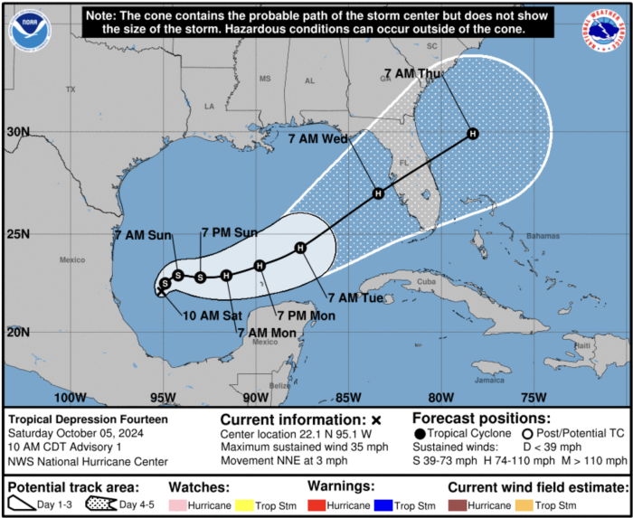 10AM CDT Oct 5: Tropical Depression Fourteen forms in the southwestern Gulf of Mexico. Forecast to strengthen and bring the risk of Life-Threatening impacts to portions of the west coast of Florida next week. Make sure to check back with updates through the weekend and into next… pic.twitter.com/V8NAaIPohi