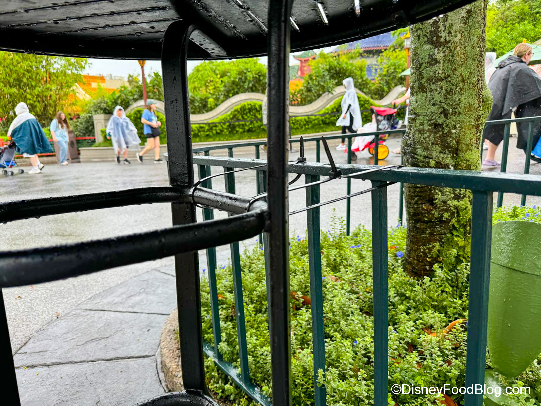 Other than closing the parks or closing the parks early, we’re already seeing signs that the parks are preparing for some rough weather. One of the things we noticed just recently is that Cast Members were using zip ties to attach tables to fences to secure them. We’ll also see table umbrellas tied up and trash cans secured ahead of the storm.