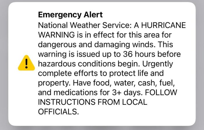 Members of our team who reside in Orange County, Florida received this message on their phones, however, it’s likely being sent out to many in the Central Florida area. The National Weather Service notes that a Hurricane Warning is in effect for Northern Lake, Orange, Osceola, Seminole, and Southern Lake counties at this time. Orange and Osceola counties are the area where Disney World is located.
