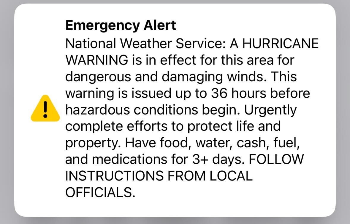 A hurricane warning message was sent out to the mobile phones of many people in the Central Florida area. The Emergency Alert comes from the National Weather Service and notes that a hurricane warning is in effect for the area.