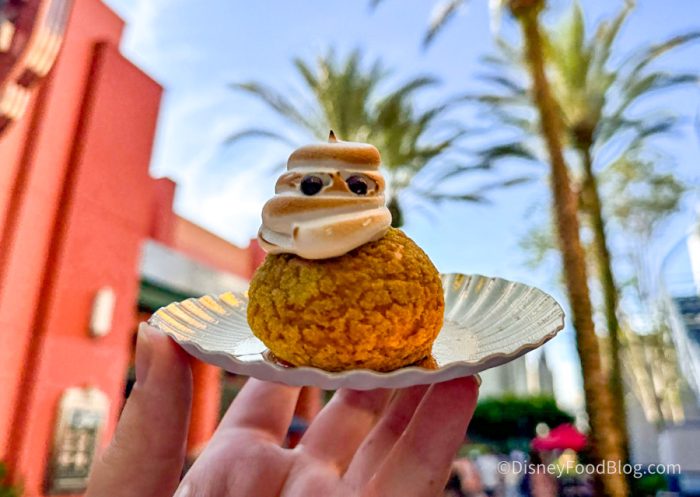 We headed over to Disney’s Hollywood Studios to try some spooky snacks for Halloween! First up is the Ghost Cream Puff from ABC Commissary for $5.49. This is a sour apple custard-filled cream puff topped with toasted meringue and chocolate chips. Yes, you read that correctly: sour apple custard. We weren’t quite sure how this one was going to play out, but boy is this a cute little snack.