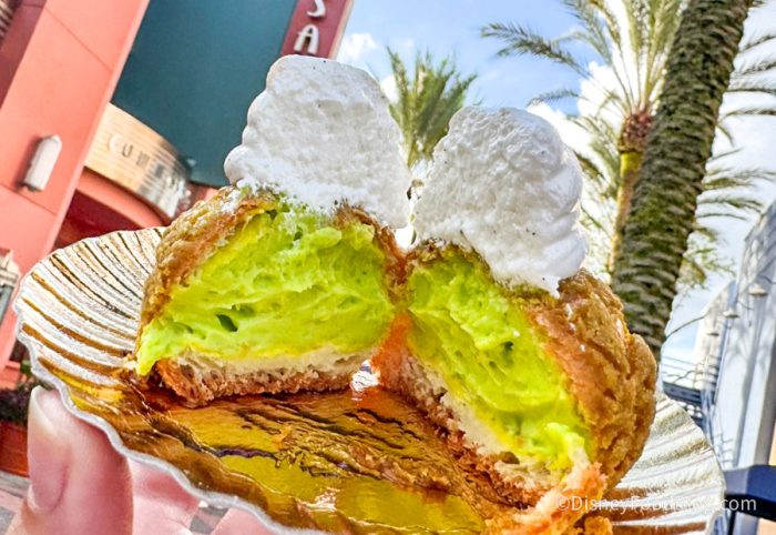 Unfortunately, the cuteness is pretty much where the good aspects of this dessert end. This might be the worst Disney World snack we’ve had in quite some time. The cream puff shell and the toasted meringue were a bit too toasty — they were on the verge of being burnt and bitter.