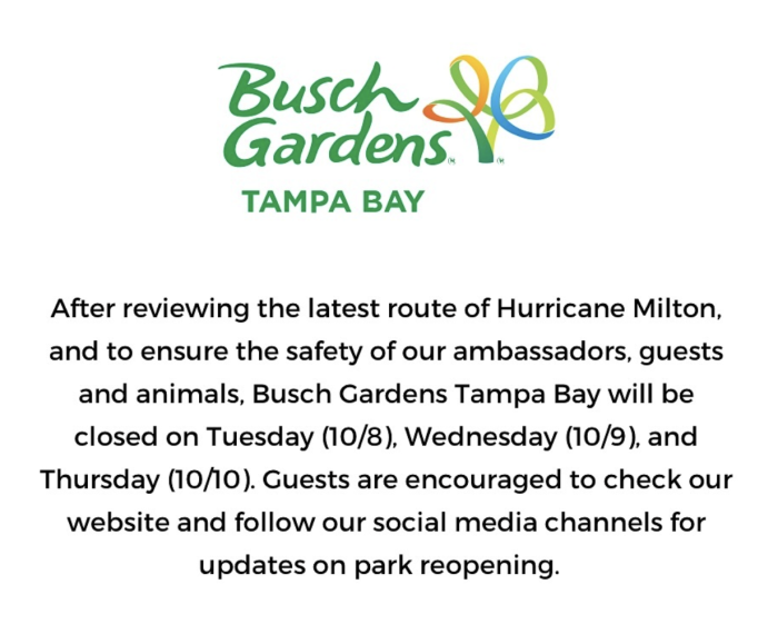 “After reviewing the latest route of Hurricane Milton, and to ensure the safety of our ambassadors, guests and animals, Busch Gardens Tampa Bay will be closed on Tuesday (10/8), Wednesday (10/9), and Thursday (10/10). Guests are encouraged to check our website and follow our social media channels for updates on park reopening.”