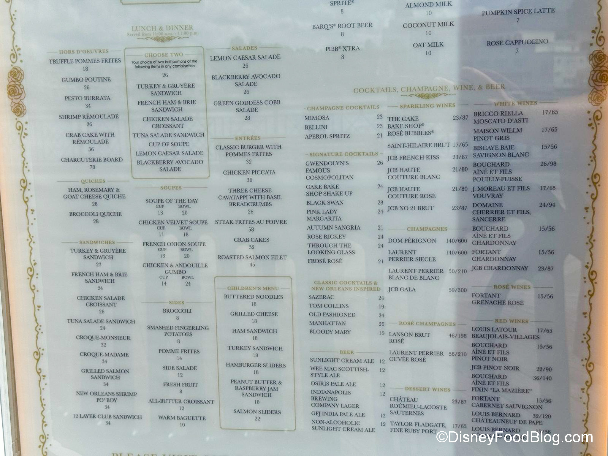 But bakery items aren’t the only items you can grab at this location — you’ll also be able to dine here for breakfast, lunch, dinner, and afternoon tea service. But with quiches for $28, a burger and fries for $32, and simple items on the children’s menu (like buttered noodles and grilled cheese) starting at $18, some Disney fans are NOT fans of these prices.