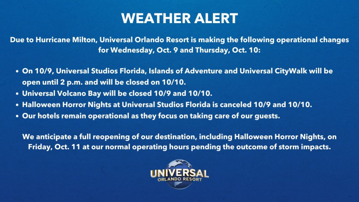 Universal Orlando Resort has just announced adjustments to their operations due to Hurricane Milton.