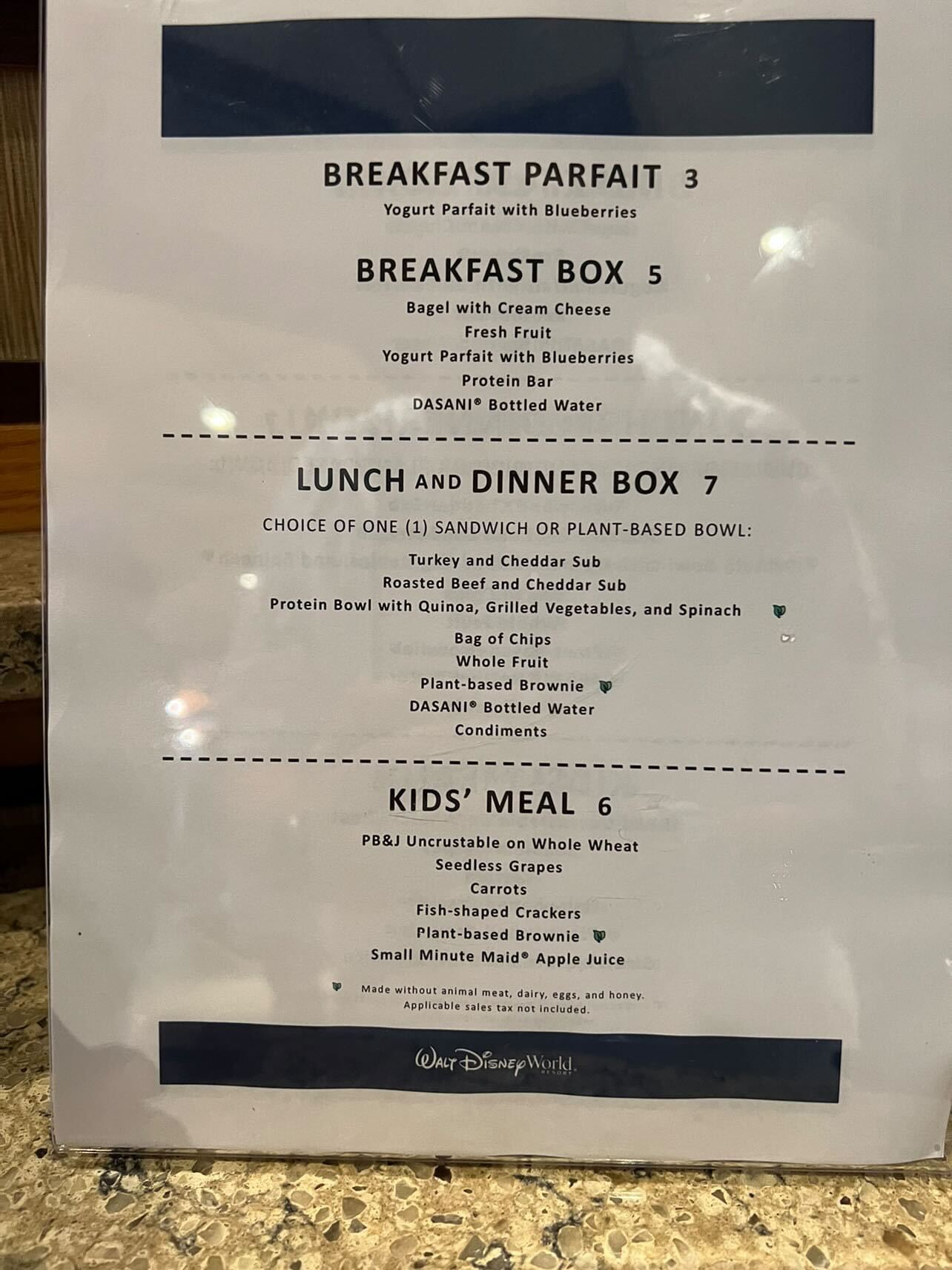 Typically, the hotels will offer some type of “hurricane food box” for purchase if you’re not able to get out to a store ahead of time. In fact, we’re already seeing these listed as “meal kits” on select hotel restaurant menus. The resort restaurants MAY also offer discounted prices or varied food selections during the storm — this isn’t guaranteed, but we’ve seen it happen in the past. The same reader above also shared some photos of what the food situation is currently like at Capt. Cook’s at the Polynesian Village Resort as of October 9th.