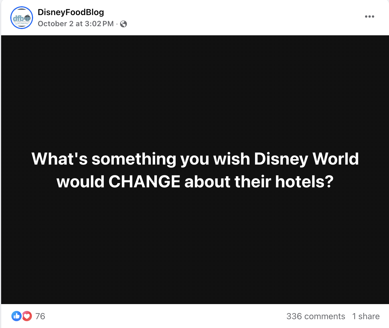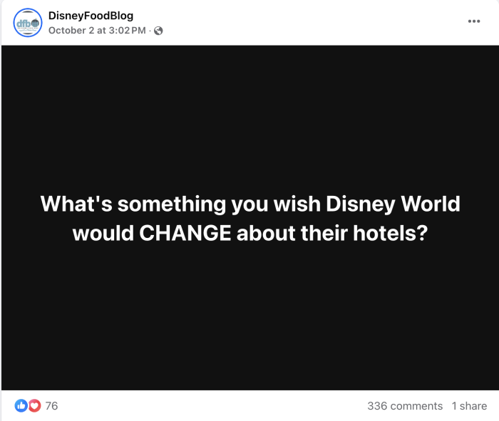 As we were saying, initially we reached out to our followers on Facebook to ask: “What’s something you wish Disney World would CHANGE about their hotels?”