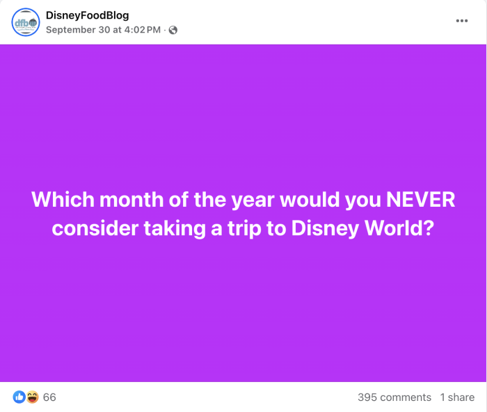 We reached out to our followers on Facebook to ask: “Which month of the year would you NEVER consider taking a trip to Disney World?” We had quite a few people leave their opinions in the comments!