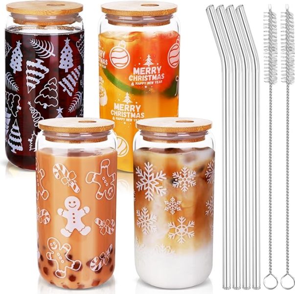 Whether it’s apple cider, iced coffee, eggnog, or whatever drink you choose, it’ll all feel special when you’re drinking them out of these Christmas Glass Cups! This set comes with 4 16-ounce mason cups, 4 bamboo lids, 4 glass straws, and 2 straw brushes. Each class is decorated with a charming Christmas-themed design, is spill-proof, and easy to clean.