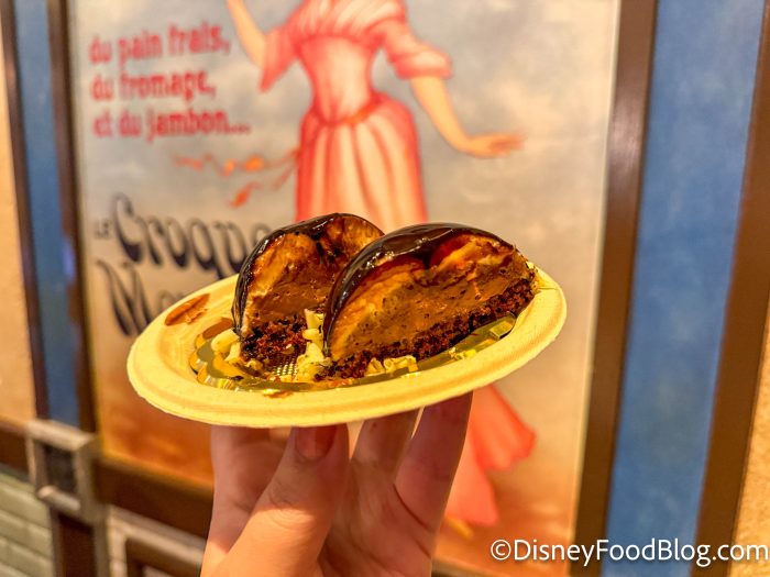 This has layers of dark chocolate and white chocolate, but the dark chocolate is definitely the overwhelming flavor. You really only get the white chocolate flavor from the shavings on the outside. The mousse is light and creamy, and the chocolate cake base is a little dry, but the textures work together well. If you love chocolate and you don’t mind super sweet treats, this might be for you — but I’m not going to tell you it’s the best chocolate dessert in the park.