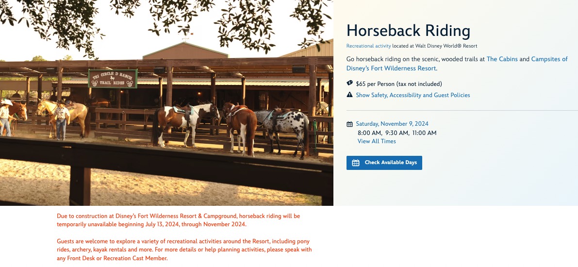 We were taking a peek at the Fort Wilderness page on the Disney World website when we noticed that it looked like the calendar had been updated. The website still features a message indicating Horseback Riding will still be closed through the end of November, but when we change the dates on the calendar — available times pop up.